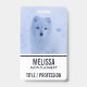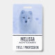 Crachá com uma fotografia de uma raposa ártica branca. Uma paisagem invernal nevada envolve essa criatura encantadora.