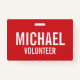 Crachá Red Volunteer com nome e título em branco negrito sans serif no fundo vermelho. Perfeito também para estagiário, tripulação, funcionarios, grupo, equipe e muito mais.