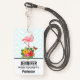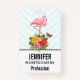 Crachá de nomes com uma ilustração digital fofinha apresentando um flamingo cor-de-rosa com uma perna levantada. Em pé sobre um buquê de flores e folhas de hibisco tropicais. Uma borboleta bonito está pairando ao redor das flores. Um padrão verde-claro e de fêmur branco no fundo.