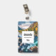 Nome de etiqueta com uma fotografia cênica apresentando árvores cobertas de montanhas em cores do outono. Um rio vibrante corre em torno de uma multidão de rochas.