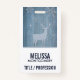 Crachá de nome com um fundo de madeira azul. Camadas sobre o topo é uma silhueta de uma rena com grandes galhadas.