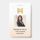 Um crachá para maquiadores, designers de unhas, estilistas de cabelo, designers, donos de salões de beleza. Um fundo de gradiente branco e bege. Adicione sua foto, título, logotipo da empresa, Voltar: seu texto.