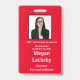 Crachá de participante de seminário em vermelho e branco. Todos os elementos podem ser alterados, incluindo: foto, nome do seminário, local e data do seminário, nome do participante, título do participante e nome da empresa.Também disponível na orientação horizontal nesta loja. Espaço no topo para cordão.