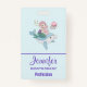 Nome crachá com uma ilustração adorável. Projetado com uma bonito sereia montando um golfinho feliz. Um pequeno amigo medusa os acompanha. Decorado com pequenos pedaços de ouro falso. Fundo azul claro com bolinhas rosa esmaecidas.