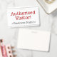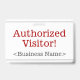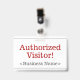 Este design de crachá simples apresenta a mensagem "Visitante Autorizado!", e um nome de empresa personalizável ou outra mensagem personalizada. Ele também apresenta uma borda de linha dupla. Um crachá como este pode ser usado para mostrar que alguém em uma empresa ou local de trabalho é um convidado ou visitante autorizado. [~Z0000307]
