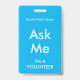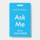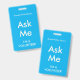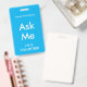 Crachás "Pergunte-me" azuis para voluntários, professores, centavos, guias, organizadores de eventos para eventos especiais, como casamentos, feiras de artesanatos, shows de casas e jardins, eventos de caridade, funções empresariais e corporativas. A cor da tipografia é marfim pálido que dá a este crachá uma aparência moderna.