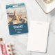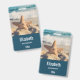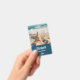 Crachá personalizado com uma foto cênica. Um grande peixe-estrela colocado em pé numa praia arenosa. Um belo mar azul com ondas de surf branco no fundo.