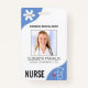 Crachá de fotos de um funcionário médico com estetoscópio e design cardíaca. A amostra mostra o título ENFERMEIRO, mas pode ser editado para qualquer posição do funcionarios. Inclua um logotipo ou exclua a imagem de exemplo. ALTERAÇÃO DE COR DE FUNDO: A cor azul de fundo pode ser alterada clicando na guia PERSONALIZAR MAIS. Entre em contato com o designer se quiser que este design seja modificado ou se precisar de assistência com cores. DICA DA FOTO: Para obter resultados mais rápidos/melhores, escolha uma foto com o assunto no meio e/ou pré-plante para uma forma quadrada ANTES de carregar e ela preencherá o espaço de fotos perfeitamente. Entre em contato com o designer se você quiser que este design seja modificado ou precisar de assistência com um código de cor específico.