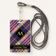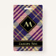 Design púrpura, ouro amarelo e tartã azul. Um padrão perfeito. Texto personalizado e monograma.