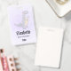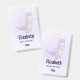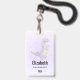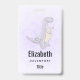 Crachá de nome personalizado com uma ilustração fofinha apresentando um dinossauro roxo cinza.