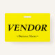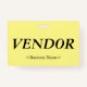 Este design de crachá tradicional apresenta a mensagem "VENDOR" e um nome de empresa personalizável ou outra mensagem personalizada. Um crachá como este poderia talvez ser usado para indicar que uma pessoa é um convidado ou visitante conhecido e autorizado numa empresa ou local de trabalho. [~Z0000307]