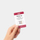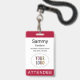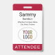 Personalize nosso crachá de participante profissional com o logotipo do evento, o nome do participante e outro texto personalizado. É plástico pvc e disponível com um jardim, clipe ou um rolo retrátil. Projetado em vermelho escuro e outras cores com uma design moderna minimalista do MISOOK. Todas as cores são personalizáveis. Você pode, opcionalmente, adicionar outro conteúdo ao verso (código QR, termos etc.). Personalize facilmente o título do participante (convidado VIP, visitante, auto-falante etc.). Nenhuma quantidade mínima de ordem e nenhuma taxa de configuração.