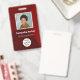 Personalize estes crachás vermelhos verticais para funcionários com uma foto do funcionário, logotipo da empresa, código de barras, ID do funcionário e nome.