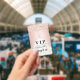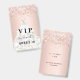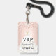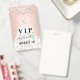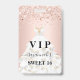 Um distintivo moderno, elegante e glamoroso para uma festa de aniversário de 16 anos, Sweet 16. Um fundo rosa com confetes e um vestido branco. Com o texto: VIP. Personalize e adicione nome, idade, data. O nome é escrito com um estilo de letra manuscrita moderna com floreios.