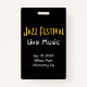 Personalize seu evento musical com crachás verticais VIP/All Access Pass. Músico de Jazz estilizado com imagem de chifre. Texto de ouro nítido sobre fundo preto para efeito máximo. Todos os detalhes na parte frontal e traseira podem ser personalizados ou removidos, incluindo cores, fontes e imagens.