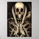Crânio e pássaro em fundo preto. Esta é uma arte gerada por IA.