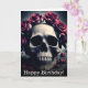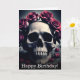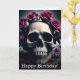 Uma pintura escura e gótica de um crânio humano rodeado por rosas e pétalas góticas pidas, apresentando uma atmosfera gótica dessaturada e de outro mundo, este cartão de aniversário é perfeito para amantes de crânios góticos escuros e flores e rosas góticos românticos escuros, dando uma mensagem de aniversário única com este único crânio gótico e Rosa de aniversário completo com texto e imagens editáveis, personalize para suas necessidades.