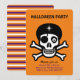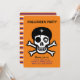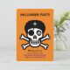 convite de festa de crânios assustadores de Halloween em fundo laranja. Todos os textos e números estão prontos para serem personalizados.