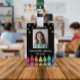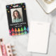 Crachá de identificação de professor de crayon vertical personalizado com foto, nome, série sob estrelas coloridas e acima de uma fileira de crayons em um gradiente de arco-íris. Crachá de identificação de professor de jardim de infância com crayons e estrelas coloridos.
