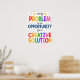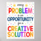 TODOS OS PROBLEMAS SÃO UMA OPORTUNIDADE PARA UMA SOLUÇÃO CRIATIVA! Faça com que os estudantes/clientes pensem com este poster atencioso, brilhante e alegre. Um poster de na moda e excelente de sala de aula/conselheiro para desafiar os alunos a pensar fora da caixa e reenquadrar o problema em uma forma de ser criativo e encontrar uma solução com objetivos! Um poster excelente para pendurar numa escola secundária ou na sala de segundo grau. Também é uma excelente poster para consultorias de orientação escolar, diretoria, terapeutas ou psicólogos para lembrar crianças e adolescentes que é tudo uma questão de perspectiva e que eles agora têm a capacidade de mudar sua própria vida buscando soluções criativas para seus problemas!