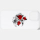 Contorno, lua da crista mecânica com engrenagens, decorada com rosas vermelhas com caules e folhas pretas em fundo branco. Steampunk