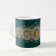 Caneca de café decorada com o design do "crescimento". O design é cercado com um fundo azul esverdeado e aparado com uma beira verde escuro.