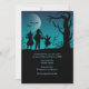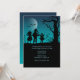 Um novo design de Halloween com a silhueta de três crianças fantasiadas debaixo de uma lua de colheita.