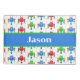 A esteira personalizada de criança divertida feita em um padrão de robô de desenho verde, azul, amarelo e vermelho. Personalize o nome para atender às suas necessidades. Adicione a decoração da sala de robôs disponível.