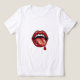 Um design surpreendente e elegante com lábios vermelhos brilhantes com presas vampiras afiadas, uma língua enrolada e um solteiro, dramático gota de sangue. Este trabalho de arte incorpora uma mistura de alura, perigo e mística gótica
