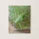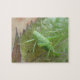 Esta quebra-cabeça espetacular mostra uma fotografia detalhada de um grilo verde feminino sentado na folha de um girassol. A fotografia foi tirada por meio de macrofotografia para mostrar esse inseto fascinante e seu ambiente com o maior detalhe.