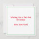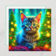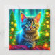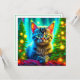 Bonito gatinho sentado em frente a árvores de Natal iluminadas personalizadas cartão de Natal.