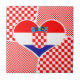 Um belo azulejo cerâmico apresenta a bandeira croata em uma colagem em forma de coração cercada por um padrão de quadro de xadrez vermelho e branco.