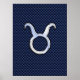 Um cromo prateado como Taurus Zodiac Sinal em um fundo impressão de fibra de carbono azul marinho. Um design moderno urbano para uma ideia personalizada de presente de excelente. Use o link "Perguntar a este Designer" para entrar em contato conosco com suas solicitações especiais de design ou para obter assistência com suas necessidades de personalização.