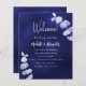 Um programa de casamento moderno, elegante, cronograma. Um fundo azul marinho, decorado com eucalipto, prigs. A cor azul é irregular. Personalize e adicione seus nomes e detalhes do casamento. Se você tiver mais texto, é possível reduzir o espaço na linha. Você também pode adicionar texto no verso. 1 folha = 1 programa impresso borda a borda.