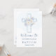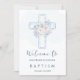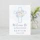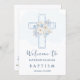 Modern watercolor blue floral Baptism announcement - Cross with white roses and bluish flowers.
