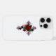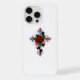 Cruzamento prateado com rosa vermelha e folhas pretas sobre fundo branco.