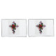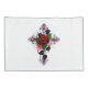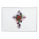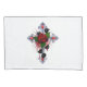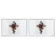 Cruzamento prateado com rosa vermelha e folhas pretas sobre fundo branco.