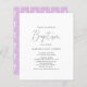 Celebre o batismo do seu filho em estilo com os nossos convites em papel, embora elegantes, amigos do orçamento! Apresentando um script moderno sobre um fundo branco limpo e um padrão de cruz branco e roxo no verso, esses convites estão prontos para seu toque pessoal para torná-los exclusivamente seus.