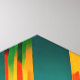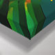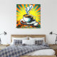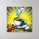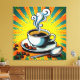 Canvas wall art with image of a steaming cup of coffee with beans scattered around all against a colorful sunburst design.