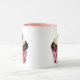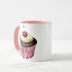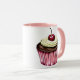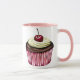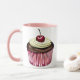 Mug em uma ilustração detalhada de um cupcake de chocolate com glacé de chocolate, uma espiral de chantilly e uma cereja no topo - faminto ainda?