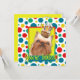 Convidem os vossos convidados com este cartão branco de saudação do cão Bruxelas Griffon. Com um cupcake balanceado na cabeça, este design certamente trará um sorriso e risos! BTW, Este design tem várias versões, com cores de fundo diferentes. Há também uma versão de Feliz Aniversário.