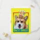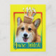 Convide seus convidados com este Cartão de Saudação Corgi Cachorro. Com um cupcake balanceado na cabeça, este design pode trazer um sorriso e risadinhas! BTW, Este design tem várias versões, com diferentes cores de fundo. Há também uma versão de aniversário feliz.