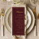 A burgundy and gold place card menu featuring elegant typography, refined accents, and space for the guest name. The rich color palette creates a timeless, upscale look ideal for formal weddings, evening celebrations, or fall events. This versatile piece works as both a menu and a place card, adding a polished, coordinated touch to each table setting.