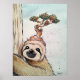 A whimsical, smiling sloth chills in a tree, accompanied by his bonsai tree house buddies perched atop his head. Cute, fun and calming, muted colors in watercolor. Perfect for any sloth or cute animal lover.