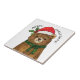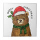 Adorable brown bear wearing a festive santa hat and green ribbon, perfect for holiday cards and gifts, watercolor illustration