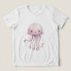 This watercolor illustration shows an adorable pastel jellyfish with a soft rounded shape and a gentle smiling expression. The translucent body is painted in delicate blush and lavender tones, while the flowing tentacles feature subtle swirl details that add movement and charm.