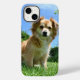 Fluffy puppy sitting in a lush green garden on a beautiful summer day.