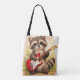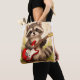 This cute raccoon tote bag features an adorable baby raccoon playing a bright red guitar, surrounded by soft floral elements and musical notes. The combination of kawaii animal style and music theme creates a fun and charming design that stands out.
