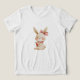 This sweet watercolor bunny illustration features a smiling baby rabbit holding a red apple, decorated with a cozy red gingham bow and scarf. Soft hand-painted textures, gentle pastel tones, and rounded shapes create a warm and comforting nursery-style artwork.