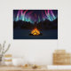 Em um vale coberto de neve em uma noite gelada no morto do inverno uma fogueira salta para cima para espelhar as luzes do norte enchendo o céu acima das montanhas distantes.